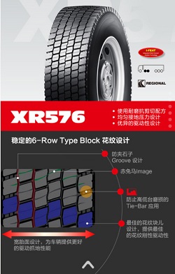 XR576使用耐磨抗剪切配方、均匀接地压力设计以及优异的驱动性设计,宽胎面的设计为车辆提供更好的驱动抓地性能。同时采用更加稳定的6—Row Type Block花纹设计,包括防夹石子Groove 设计;赤兔马Image;防止高低台磨损的Tie—Bar应用;最佳的花纹块儿设计,提供最佳的花纹刚性驱动性。
