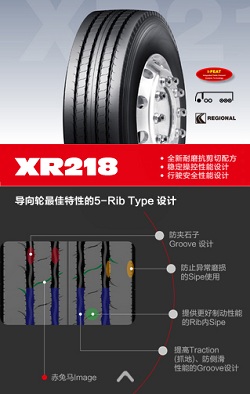 其中XR218采用全新耐磨抗剪切配方,更加稳定的操控性能设计,以及保障行驶安全性能设计。其导向轮采用了最佳特性的5—Rib Type设计,包括防夹石子Groove设计;防止异常磨损的Sipe使用;提供更好制动性能的Rib内Sipe;以及提高Traction(抓地)、防侧滑性能的Groove设计。
